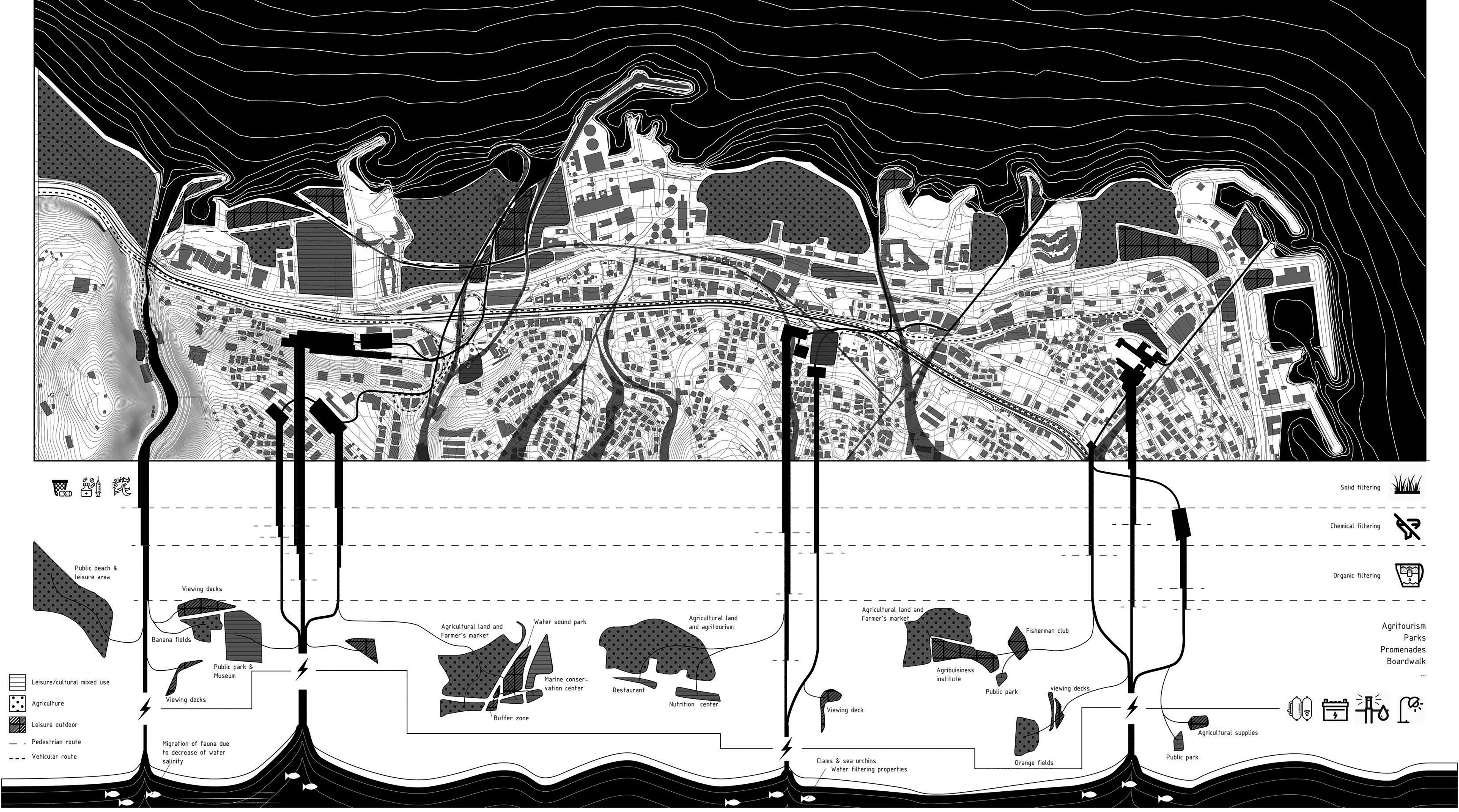The studio looked at the relationship between sea and land, their edge conditions and variations. It aimed to reconsider new forms of leisure that can emerge at that front, incorporating a diversity of programs, users, and possible activities. The studio specifically looked at the derelict sites of Zouk Mosbeh, Lebanon, with their diverse land use, existing agricultural and residual spaces, large beach resorts and industrial structures. It explored various forms of “beach architecture” by looking at Mediterranean case studies, and devised a macro landscape / urban strategy with an architectural intervention in the area. The research culminated in the form of an architectural intervention that operates at many levels, bridging the gap between the exiting infrastructural networks, the landscape and ecology of the area, and most importantly the waterfront condition