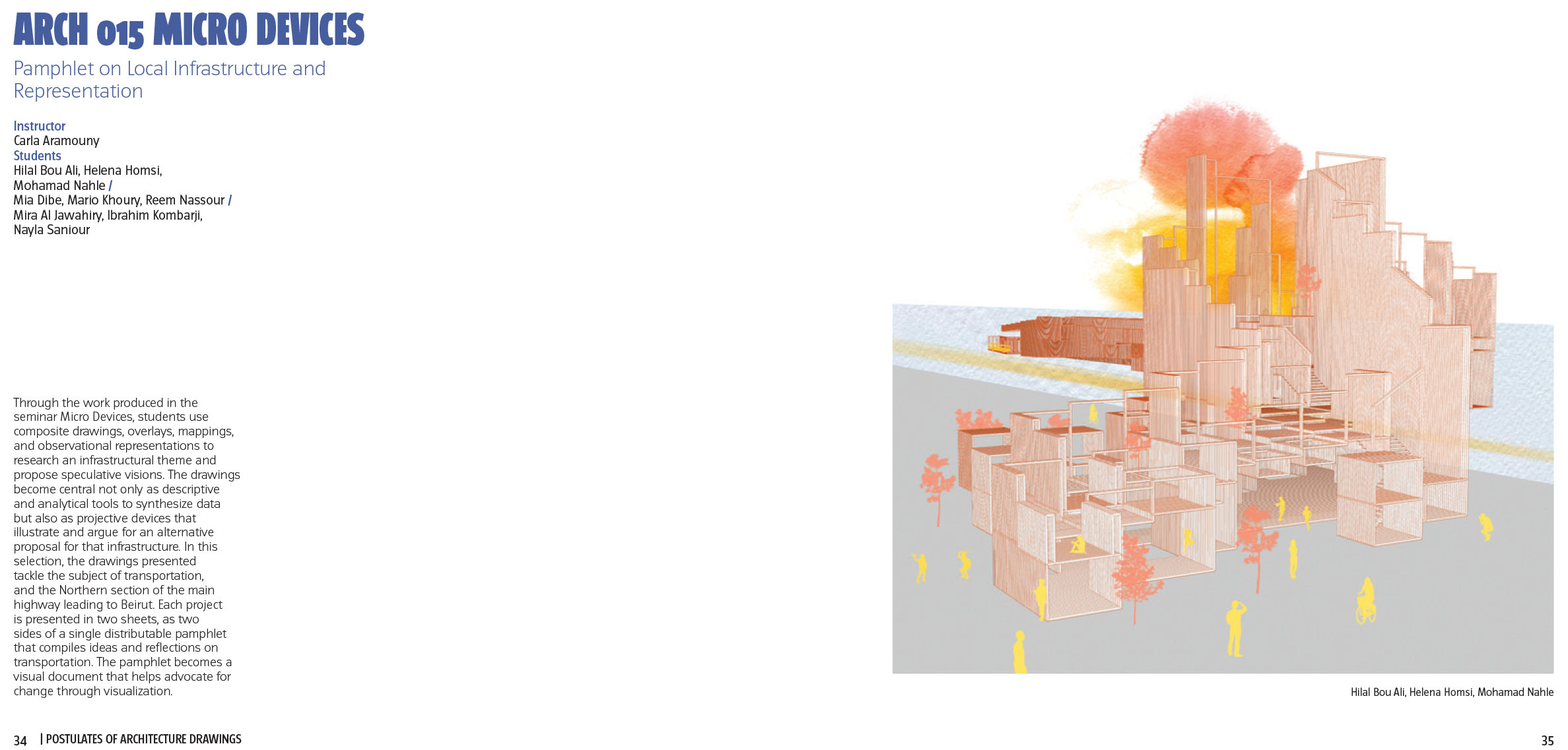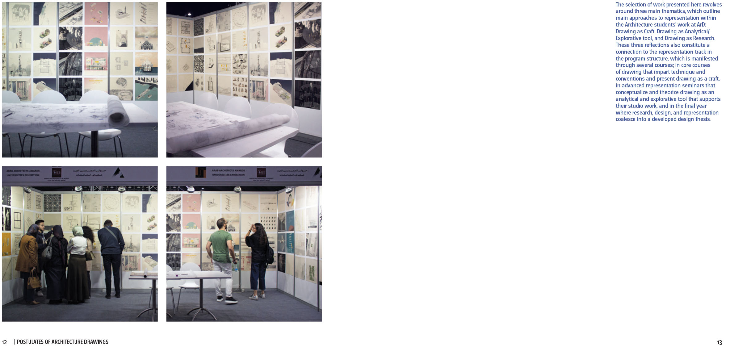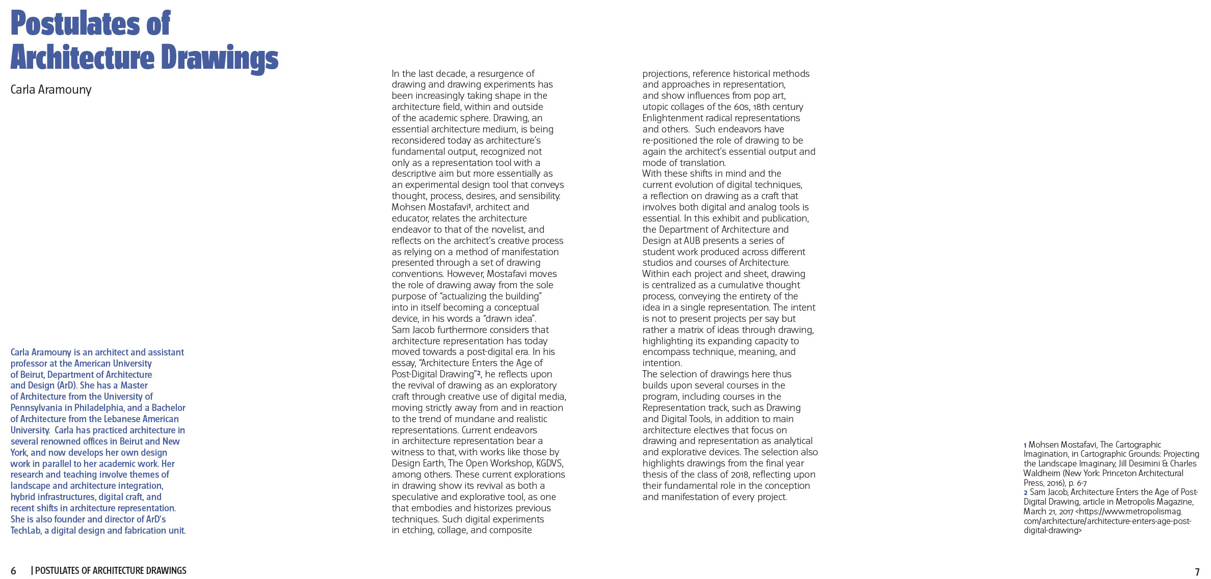 This publication published at the Department of Architecture and Design (AUB) compiles and presents a matrix of architecture students’ drawings previously displayed in the exhibition, “Postulates of Architecture Drawings”. (During the 2018 Arab Architects Awards event, organized by the Order of Engineers and Architects in Beirut). Within each sheet, drawing is centralized as a cumulative thought process, conveying the entirety of the idea in a single representation. The intent is not to present projects per-say but rather a matrix of ideas through drawing, highlighting its expanding capacity to encompass technique, meaning, and intention. The selection of work presented in the book revolves around three main thematics, which outline main approaches to representation within the Architecture students’ work at AUB: Drawing as Craft, Drawing as Analytical/Explorative tool, and Drawing as Research.