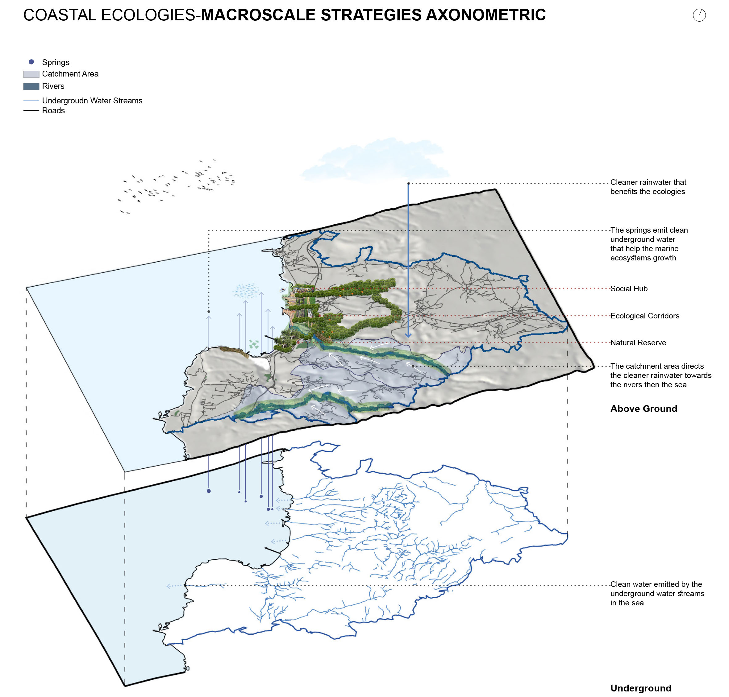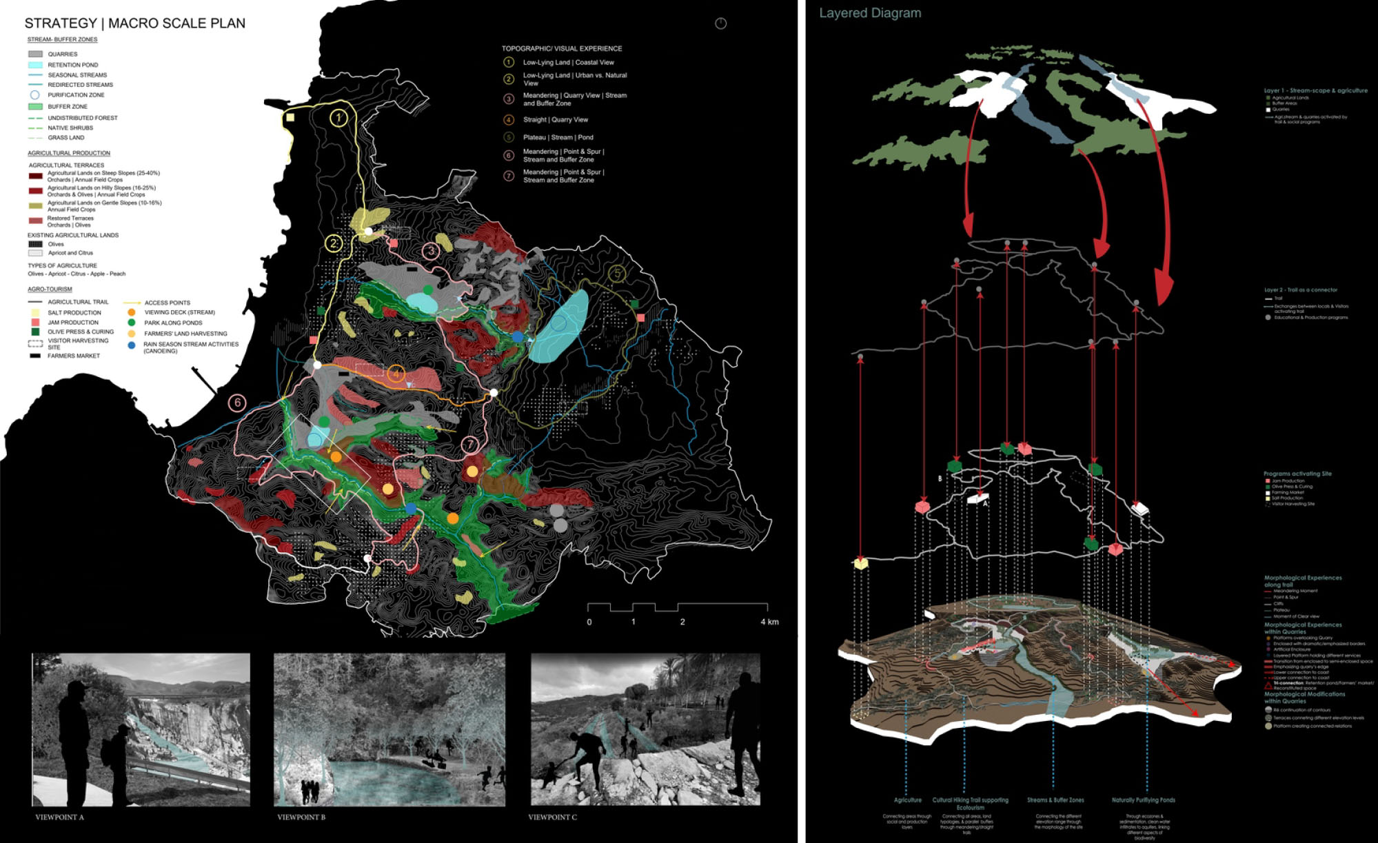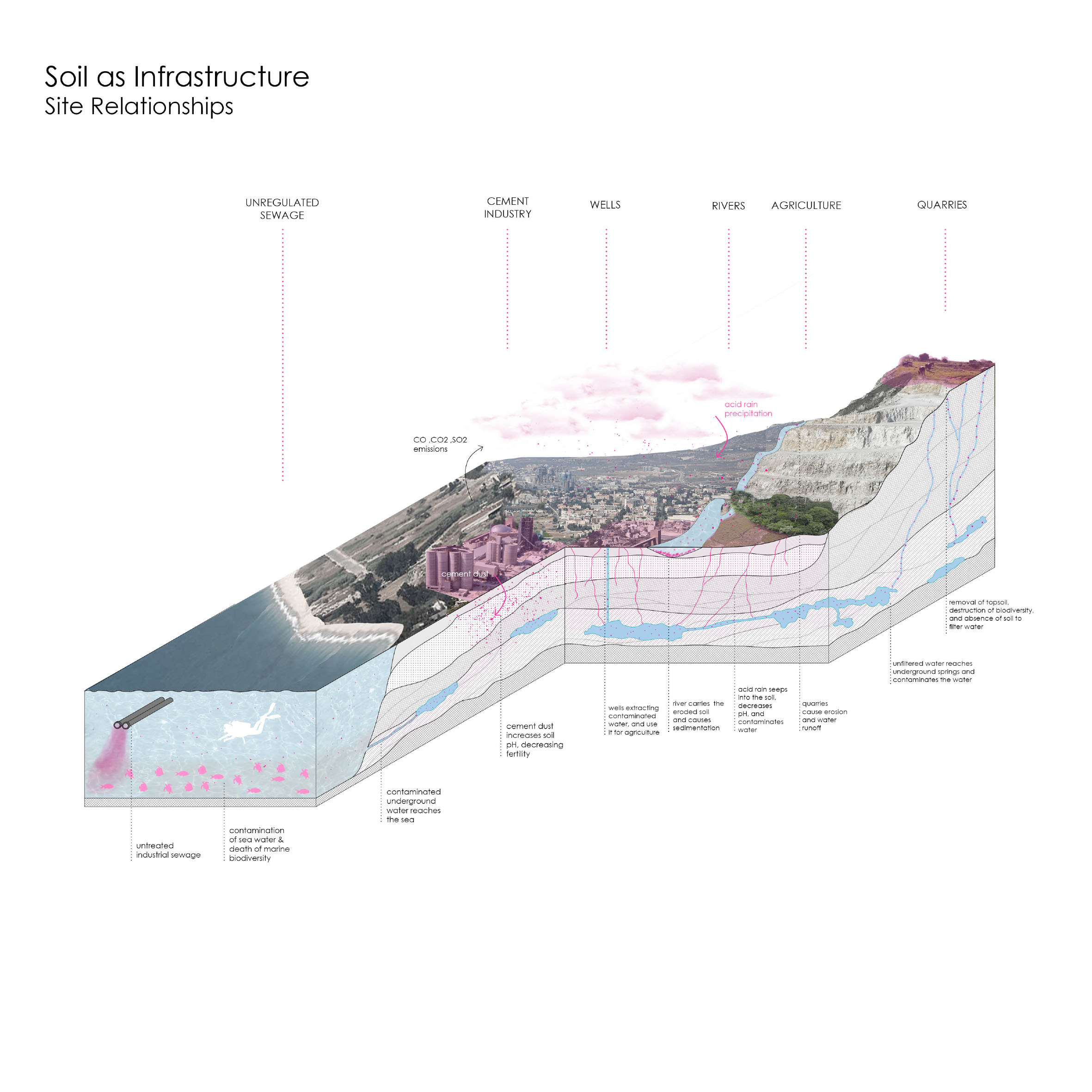 The studio’s premise focused on the inevitable impact of technologically driven development on the built and natural environments, and resource extraction on the living landscape. This is particularly evident in Chekka, Lebanon, where the production of cement and industrialization have radically reshaped the natural hills with effects far stretching to the neighboring coast, towns, and ecosystems. The studio thus worked to develop an ecological design approach, where landscape and architecture are considered as integrated and mutually symbiotic systems that operate within a larger social, cultural, infrastructural, and environmental framework. The students worked on the areas of Chekka, Al Heri, Bednayel, and their surroundings as potentially rich ecological, cultural, and economically viable areas in dire need for a comprehensive redesign and a re-naturalized vision.