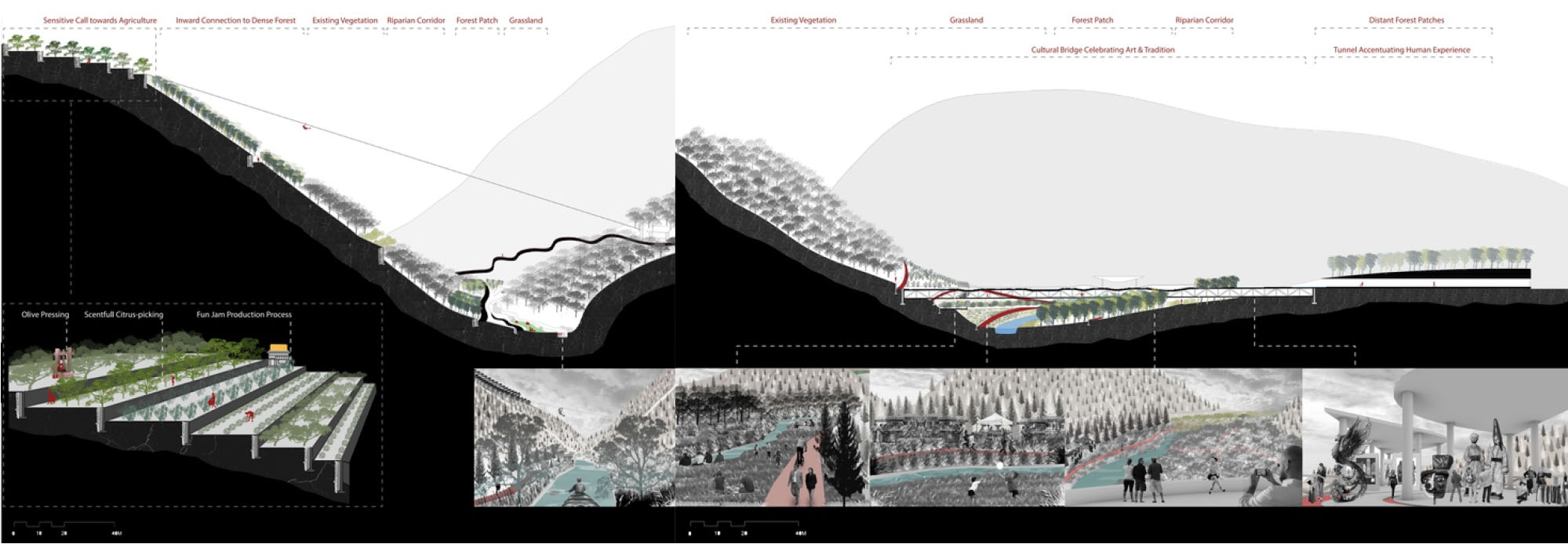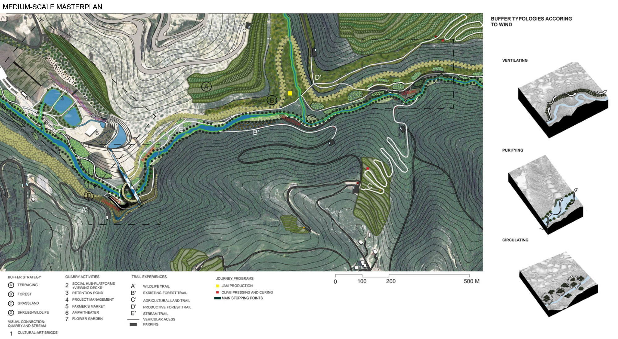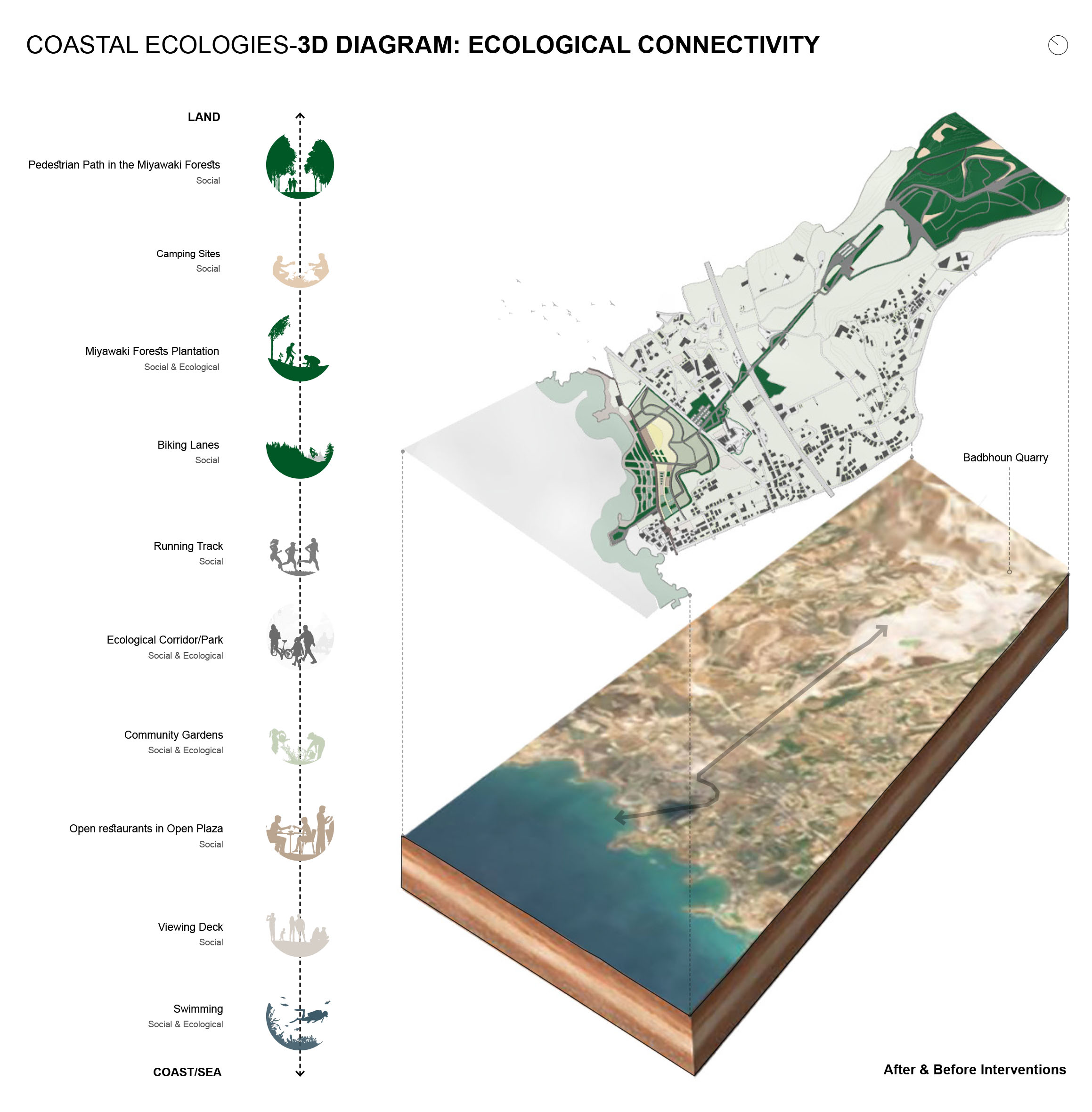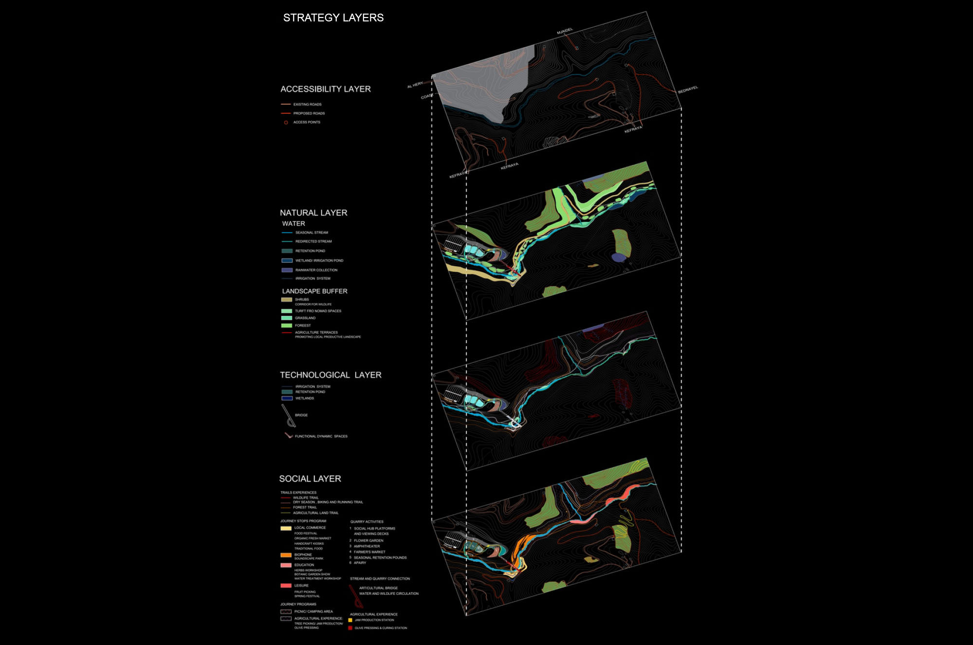 The studio’s premise focused on the inevitable impact of technologically driven development on the built and natural environments, and resource extraction on the living landscape. This is particularly evident in Chekka, Lebanon, where the production of cement and industrialization have radically reshaped the natural hills with effects far stretching to the neighboring coast, towns, and ecosystems. The studio thus worked to develop an ecological design approach, where landscape and architecture are considered as integrated and mutually symbiotic systems that operate within a larger social, cultural, infrastructural, and environmental framework. The students worked on the areas of Chekka, Al Heri, Bednayel, and their surroundings as potentially rich ecological, cultural, and economically viable areas in dire need for a comprehensive redesign and a re-naturalized vision.